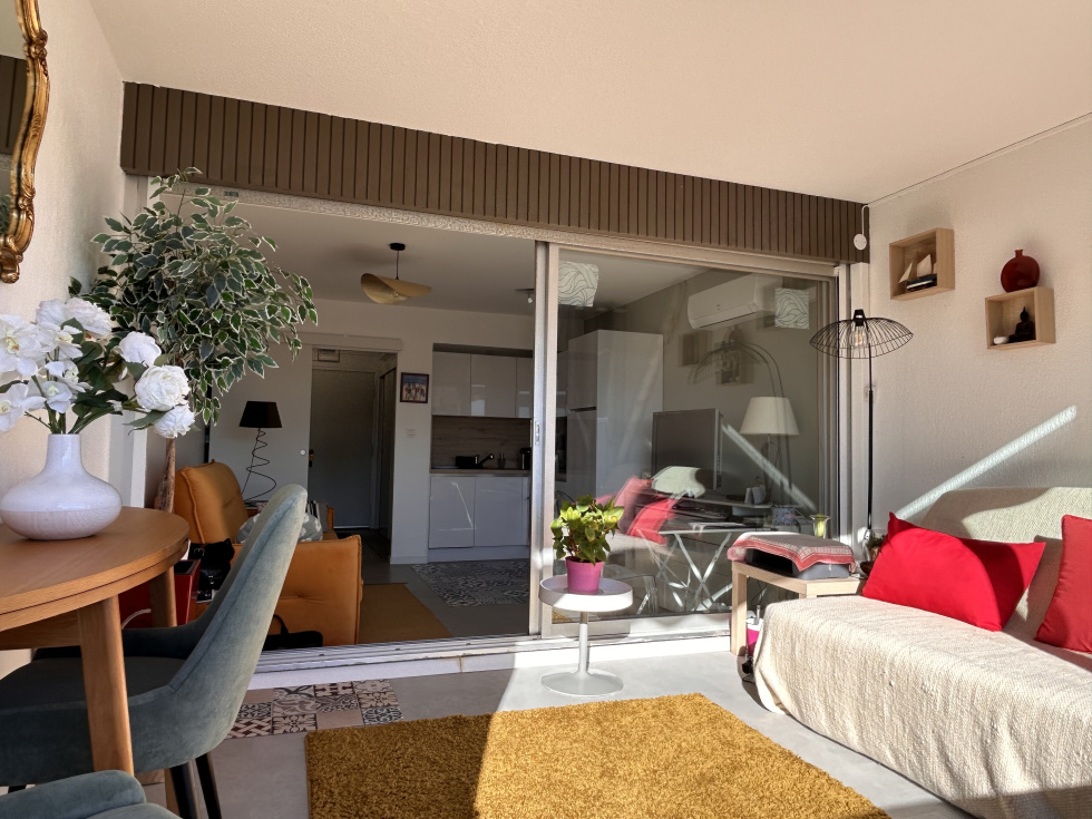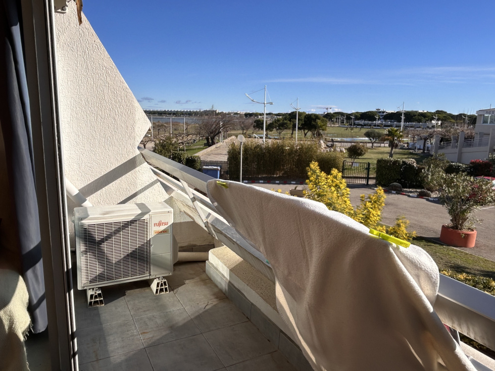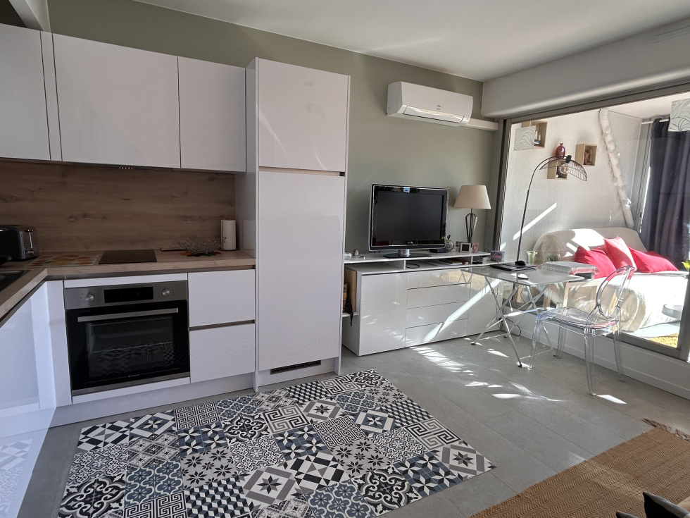 PORT CAMARGUE PLAGE NORD Dans une belle résidence située au bord de la plage et disposant d’un ascenseur. Superbe studio cabine récemment rénové exposé SUD-EST au 1er étage comprenant une entrée avec une cabine pour lits superposés, une salle d’eau, un WC séparé et un séjour avec cuisine équipée. Une loggia fermée d'environ 10 m² avec une baie à 3 vantaux en double vitrage (surface carrez hors loggia = 22.88m²) et un espace extérieur de de 3.76 m². Climatisation réversible, store banne électrique, volet roulant électrique. Vue mer latérale depuis la loggia. Vendu avec un cellier d'environ 1.26 m² (1.28 X 0.99m) Parking commun sécurisé dans la résidence Bien soumis au statut juridique de la copropriété. Charges annuelle de copropriété : 808€ Nombre de lots principaux et secondaires : 193 Taxe foncière : 664€